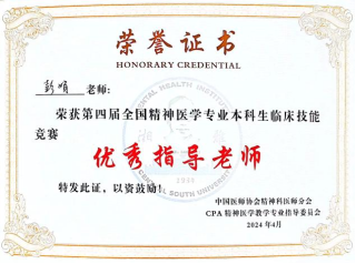 比赛准备期间,彭娟教授倾情指导,分享经验,是我们成功的关键助力。本次比赛彭娟老师荣获第四届全国精神医学专业本科生临床技能竞赛优秀指导老师。