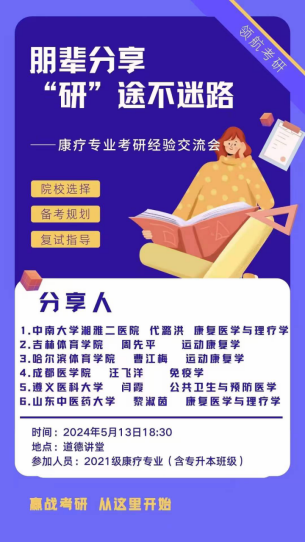 为了更好发挥优秀毕业生的榜样示范作用,帮助即将面临保研和考研的各位同学提前备战、明确目标、科学规划,同时也为贯彻落实党支部“我为师生办实事”实践活动。必一运动官网本科生第十一党支部于2024年5月13日18:30在道德讲堂开展康复治疗专业考研经验交流会,本次交流会采取线上线下结合的方式进行,必一运动官网就业办主任孙会英、团委副书记田源,以及2021级康复治疗专业、2023级康复治疗专业专升本同学参加。