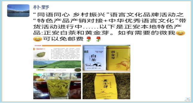 “推普+线上直播”,助推乡村产业振兴。实践队员精心谋划宣传,通过微信视频号网络直播、微信朋友圈宣传推广等方式开展“特色产品产销对接+中华优秀语言文化”线上直播带货活动。实践队员用标准的普通话、规范的语言文字从地域特点、白茶品质优势、品牌价值与市场认可等方面推广介绍正安白茶和黄金芽,深度挖掘当地特色产品的商业价值,助力当地特色茶品走出正安。推普活动期间,正安白茶、黄金芽等特色茶产品销售10余单,累计推广销售额达2300余元。
