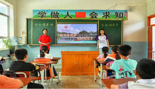 “推普+专题培训”,提升语言使用能力。推普实践队与南京理工大学常青藤支教队相互配合,联合开展“说好普通话 写好规范字”专题讲课。队员们通过课堂小游戏等喜闻乐见的方式激发小员工们说普通话、讲规范字的浓厚兴趣,寓教于乐,绕口令、诗词朗诵、书法小比赛等推普内容层出不穷……小朋友积极主动参与、踊跃互动。一幅幅字迹略带生涩的书法作品、一阵阵响亮的诗词朗诵声,营造出浓厚的普通话推广使用氛围,乡村小员工们学习汉语言文字的认真踏实精神在推普课堂上展现得淋漓尽致。