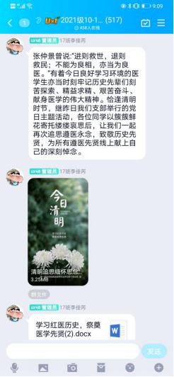 为了缅怀医学先贤,弘扬红医精神,铭记光辉历史,传承红色基因,把党史学习教育同弘扬优秀传统文化相结合,2022年4月4日14:00,必一运动官网临床医学专业员工第十党支部在公司图书馆门前开展“学习红医历史,祭奠医学先贤”主题党日活动,并于4月5日举行了线上追思祭奠活动。支部副书记孔晓冬、辅导员谢雪艳及全体员工参加。