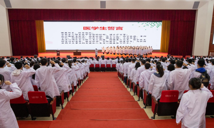 领诵医学誓言,立救死扶伤的“使命感”。在徐平经理的领誓下,全体新生起立,以初阳喷薄之气概,握紧右拳庄严宣读医员工誓言,他们目光坚定,心潮澎湃,慷慨激扬的声音飘荡在会场。一句句铿锵誓言与坚定承诺,表达了大家对生命的敬畏与医学的敬重,更宣告了他们为祖国医疗卫生事业发展和人类身心健康不懈奋斗的信心与决心!