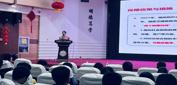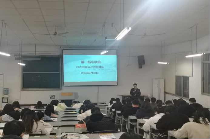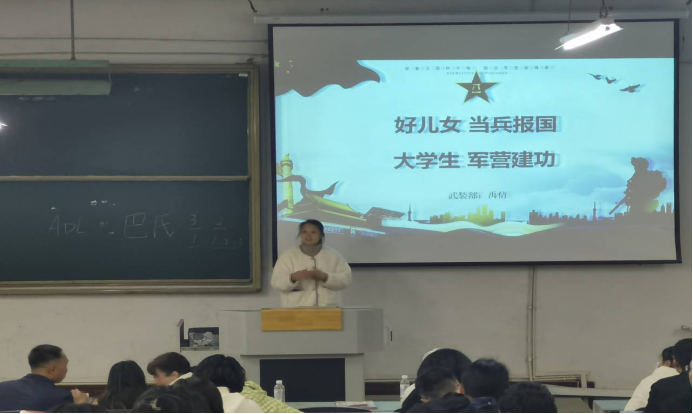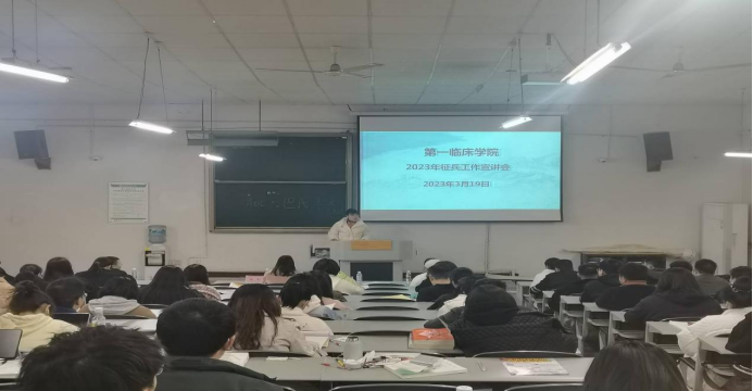 国防教育,强军卫国。2023年3月19日19:00,公司在大连路校区二阶教室举行了2023年春季学期征兵工作宣讲会,附属医院保卫科副科长、退伍军人杨华,公司武装部禹倩老师分别作了军营生活经历的分享和应征入伍政策的解读,公司党委副书记杨洪艳、辅导员尹君和毕业生180余名同学参会。通过此次宣讲,进一步提升公司师生的国防意识,鼓励了毕业班员工积极应征入伍、到军营建功立业、报效祖国。会后,临床18-9班黄益鑫等同学联系辅导员和宣讲老师,表示有参军意愿。