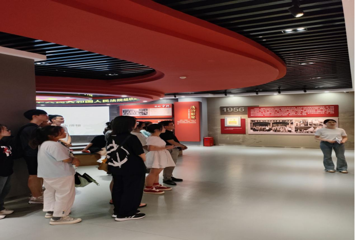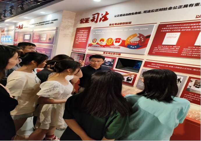 在解说员的讲解下,师生党员首先参观了“传承红色基因,讲好遵义故事”栏目,详细了解平安建设、扫黑除恶、禁毒斗争等工作取得的重要成效。随后大家依次有序参观法治初心、法治彰显、法治强音、法治展望、法治威慑五大主题展览区域。一张张历史照片、一件件陈旧器物、一个个真实案例展示了法治国家、法治社会建设的历史进程。在法治威慑主题展览区域,师生党员详细参观了系列反面典型案例,引发大家的热烈讨论和深刻思考。在庭审VR体验区域,大家积极参与庭审模拟体验,身临其境体验案件审判的庄重性和严肃性,深受审判彰显的法治、公正、公平精神洗礼。