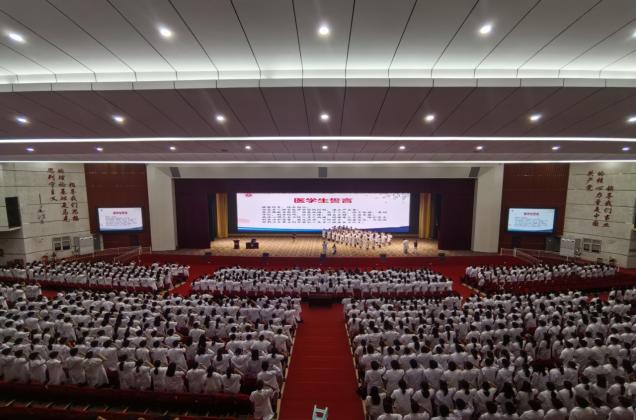 领诵医学誓言,担负神圣使命。在王东红经理的带领下,整个会场响起了庄严的宣誓声。全体起立,以初升朝阳的豪迈气概,紧握右拳,庄严宣读医员工誓言。一句句誓言,充满了对生命的深深敬畏和对医学的崇高敬仰,昭示了同学们矢志不渝地为祖国医疗卫生事业和全人类身心健康奋斗的坚定信念与无畏决心。