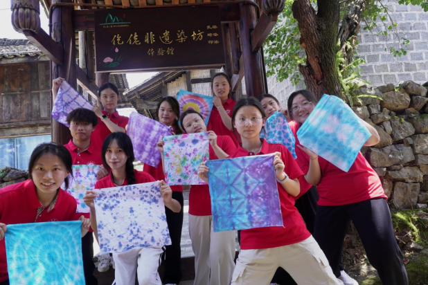 仡佬族扎染如一抹灵动的文化印记,牵引着实践团队探索的脚步。在工作人员李雪莲老师的介绍下,队员们走进古寨非遗染坊体验馆,向扎染传承人杨旭玲老师潜心研学:从草木灰水脱浆的布料预处理到“打结法”“折叠扎”等精巧捆扎技艺,再到蓝草天然染色的自然之法,每一步都流淌着民族生活的智慧。队员们携手完成捆扎、浸染、拆线、晾晒过程,于蓝白交织的纹样间,触摸“预设与偶然”碰撞的独特美感,体悟“随形就势、因扎得纹”的创作哲思。等待成果的间隙,队员们与杨老师深聊传承现状、学艺方向,读懂“匠心”与医学精神的共通内核,让这门古老技艺在联合实践中绽放新生机。