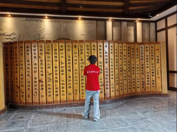 循着仡佬文化的历史脉络,实践团队踏上寻根之旅。在九天母石景区,队员们驻足祭祖圣地天主坳观望仡佬族发源地九天母石,于形态各异的母石群与古朴祭坛间,追溯其与“濮人”始祖传说的千年羁绊;通过与当地文化工作者、仡佬族乡亲促膝交流,收集关于九天母石的民间故事、变迁记忆,深深感受到这片土地在民族身份认同中的精神价值。走进中国仡佬民族文化博物馆,队员们在丹砂文化展厅细品文物风华,从铜扁壶纹饰到传统服饰巧思中梳理古今文脉,更合力解读“三幺台”、傩戏等民俗密码,在探索中让民族根脉愈发鲜活闪亮。