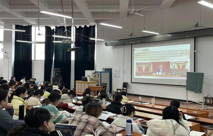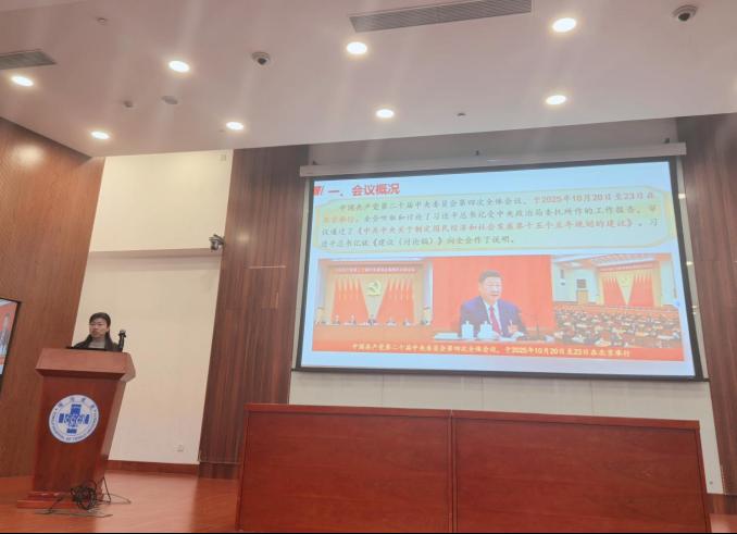 以宏阔视野把握时代方位。课上,杨洪艳解读传达了党的二十届四中全会核心要义。全会总结“十四五”时期成就:在党中央领导下,我国顶住国际复杂形势,综合国力跃上新台阶,为“十五五”发展筑牢基础。会议明确“十五五”是基本实现社会主义现代化的关键期,围绕“推动高质量发展”核心,确立了党的全面领导、人民至上等六项原则,设定“十五五”期间高质量发展取得突破、2035年基本实现现代化的目标,并重点强调了部署高水平科技、自立自强与全民族文化创新等任务。此次会议是在全面建设社会主义现代化国家进入关键阶段召开的重要会议,具有承前启后的深远历史意义。