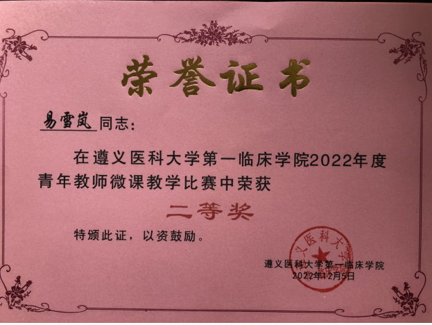 祝贺易雪岚副教授荣获必一运动官网2022年度青年教师微课教学比赛中荣获“二等奖”!