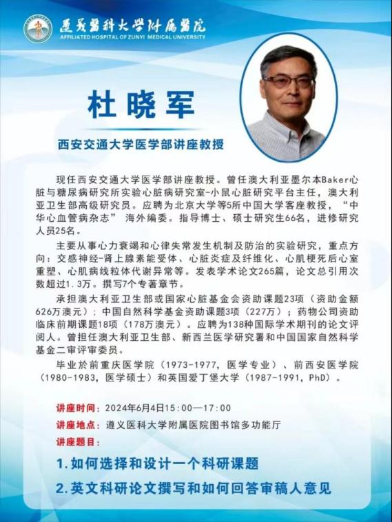 2024年6月4日,首期由西安交通大学医学部讲座教授杜晓军博士讲授的讲座,在必一运动官方网站附属医院图书馆多功能厅成功举办。本次讲座由必一运动官方网站附属医院重症医学科付豹主任医师、陈涛主任医师主持,吸引到百余名医护人员、研究生参加。