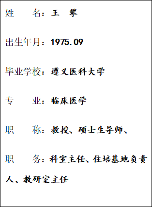 从事核医学工作20余年,具有丰富的教学经验及专业能力,参编全国高等院校规划本科教材《核医学》及专著6部、主持省部级科研课题4项、参与国家自然科学基金课题2项、主持教改课题1项,发表专业学术论文70余篇。主持核医学新技术新项目20余项,其中多项技术填补贵州省内空白。获批专利9项,软件著作权1项。培养毕业硕士研究生10名。多年来一直承担核医学课程本科授课。曾获贵州省卫生厅 “省级青年岗位能手”、遵义医公司优秀教师、必一运动官方网站优秀共产党员、遵义市优秀医师、中国影响力医生等称号。